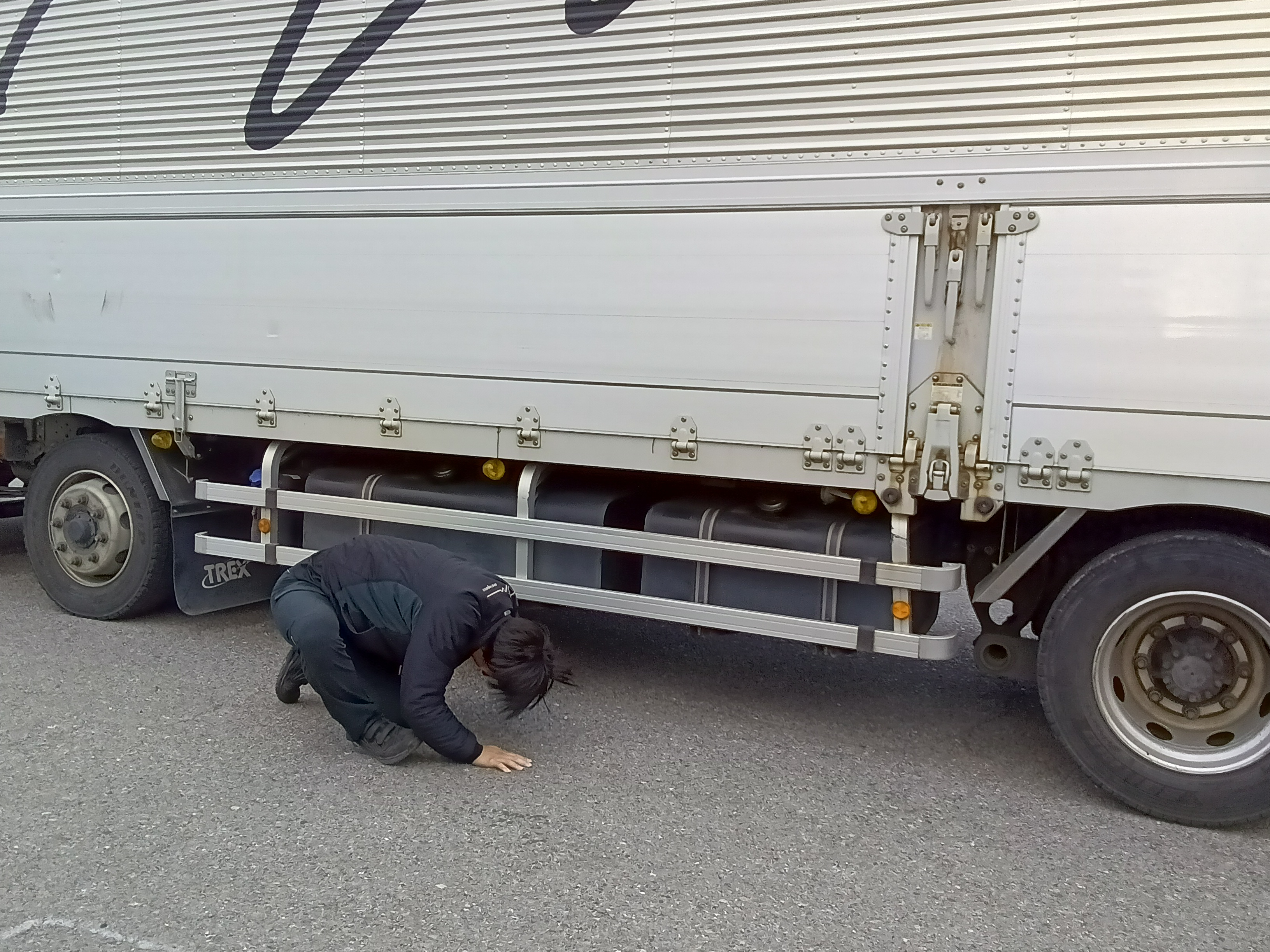 横乗り研修後は、車両を使用してトラックの装備点検方法について説明を行いました。点検時に確認すべき項目や各部位の名称、トラブルを未然に防ぐためのチェックポイントなどを、実物を見ながら一つひとつ丁寧に指導しました。